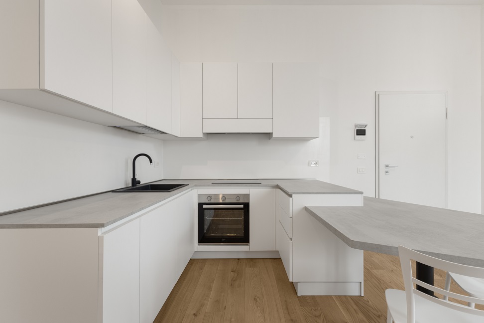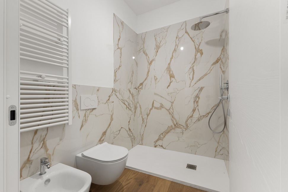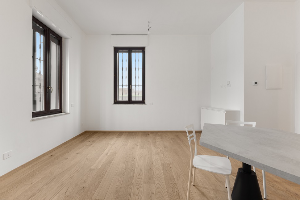 Le finiture sono di livello: parquet in rovere in tutti gli ambienti, gres di alta gamma nel bagno, serramenti in PVC ad alto isolamento termoacustico, porta blindata e porte interne di primaria marca.