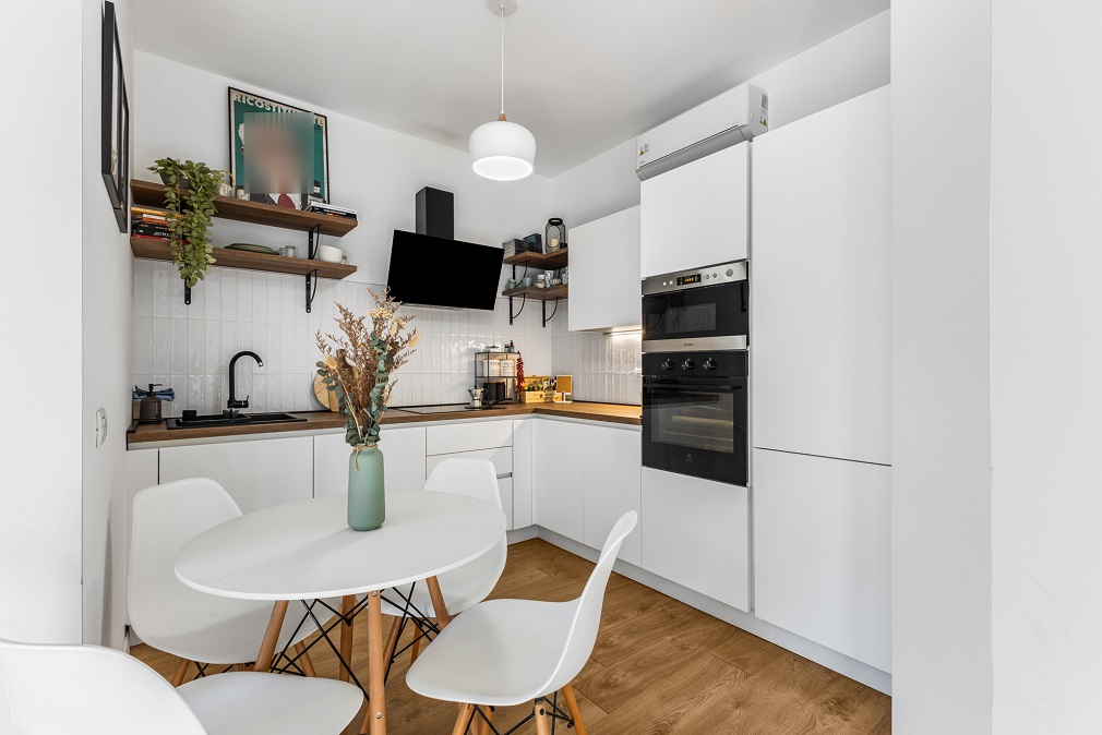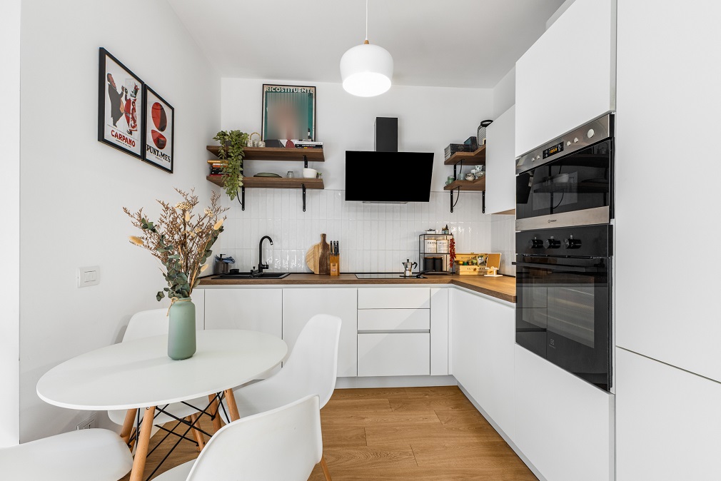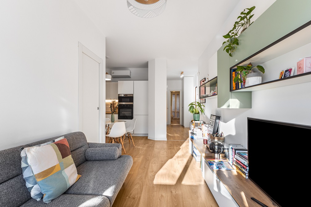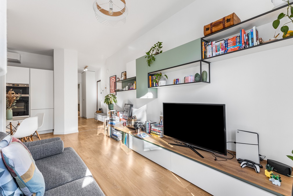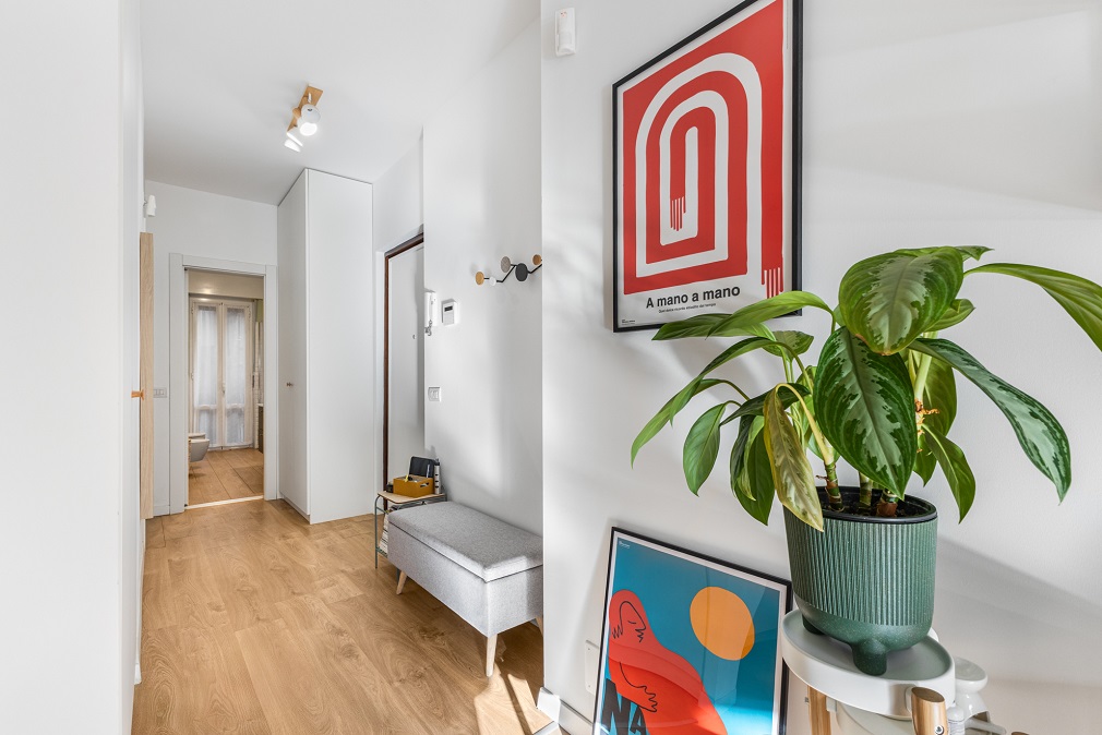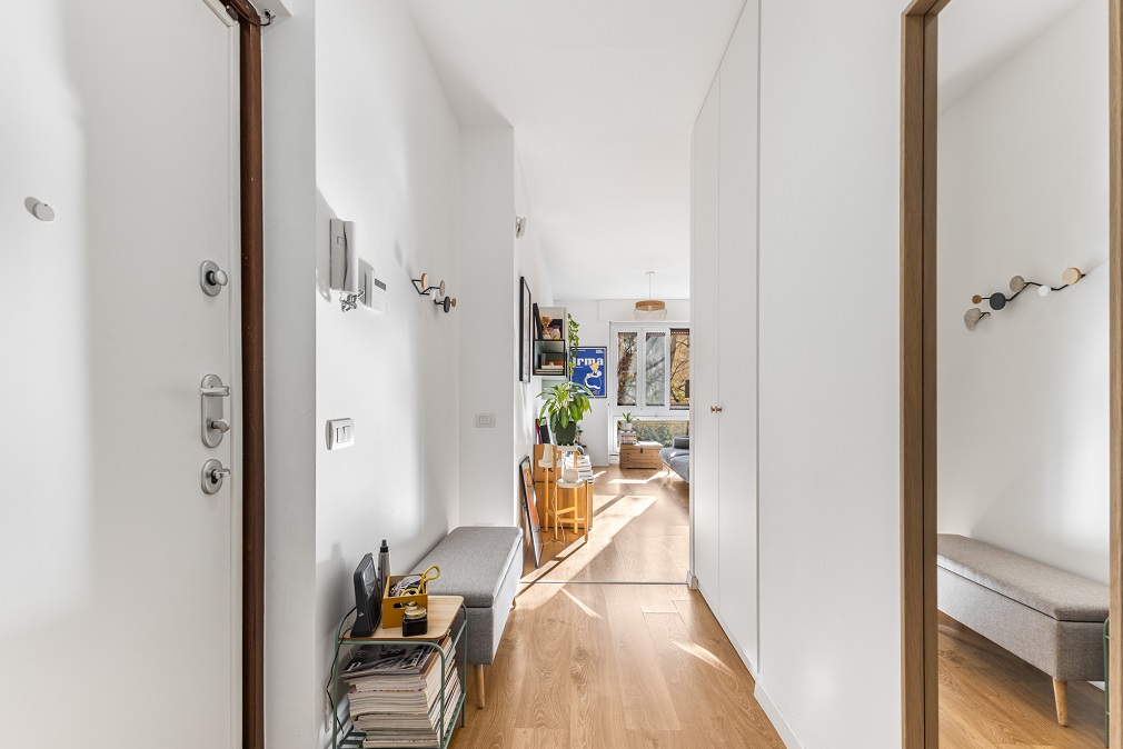 L’abitazione si distingue per spazi ben distribuiti e finiture moderne: l’ingresso conduce a un comodo disimpegno con armadiature su misura, che accompagna verso il luminoso soggiorno con angolo cottura.