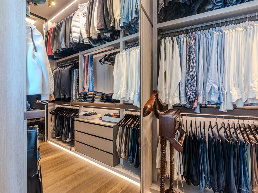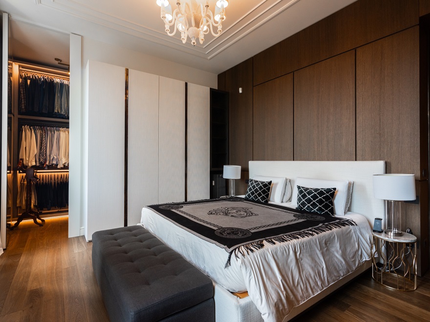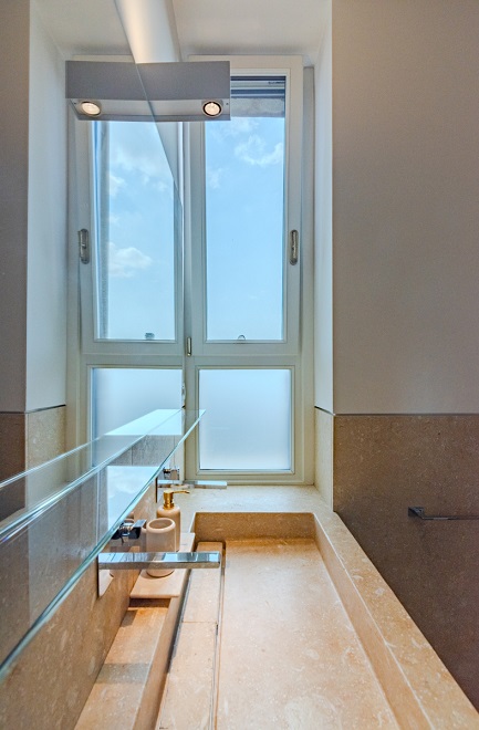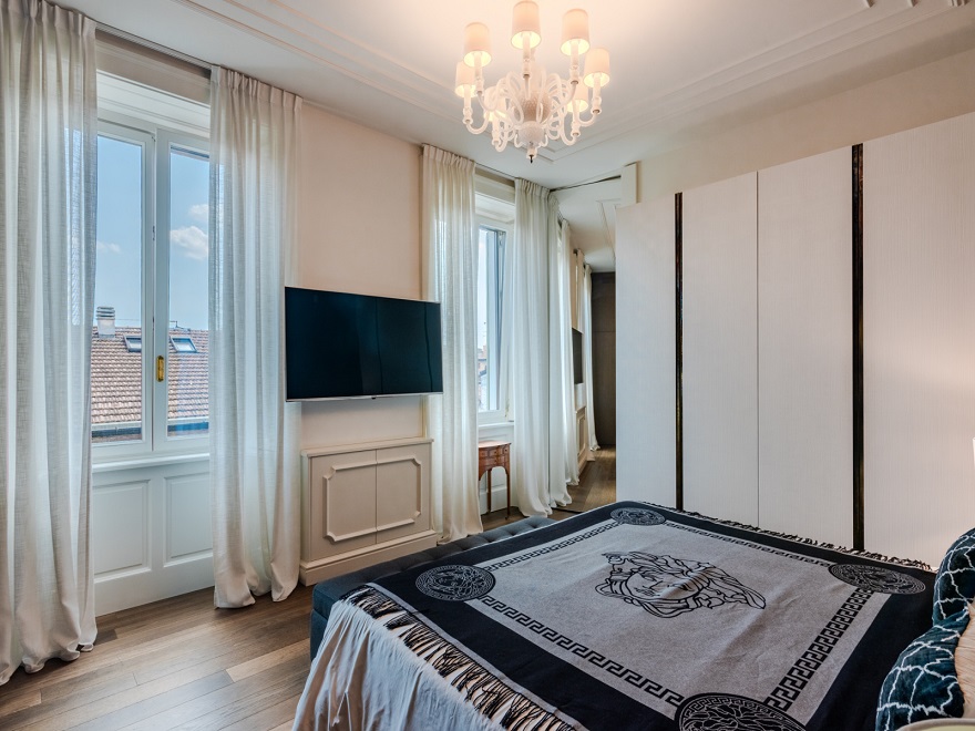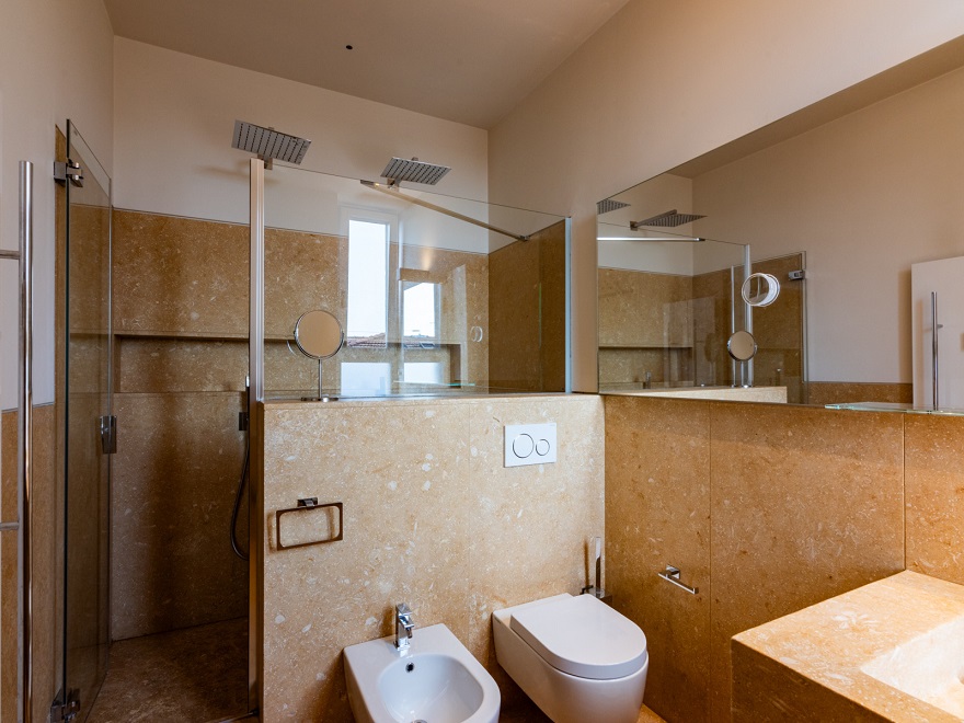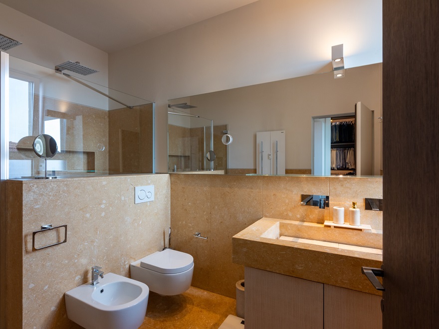 La suite padronale sorprende con bagno in pietra naturale e doppia cabina armadio in pelle; una seconda matrimoniale dispone di bagno dedicato; la terza camera è ideale come terza stanza o studio.