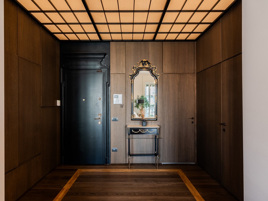 L’ingresso, con boiserie su misura e luce scenografica, introduce al living: uno spazio accogliente con camino a bioetanolo e sala da pranzo.
